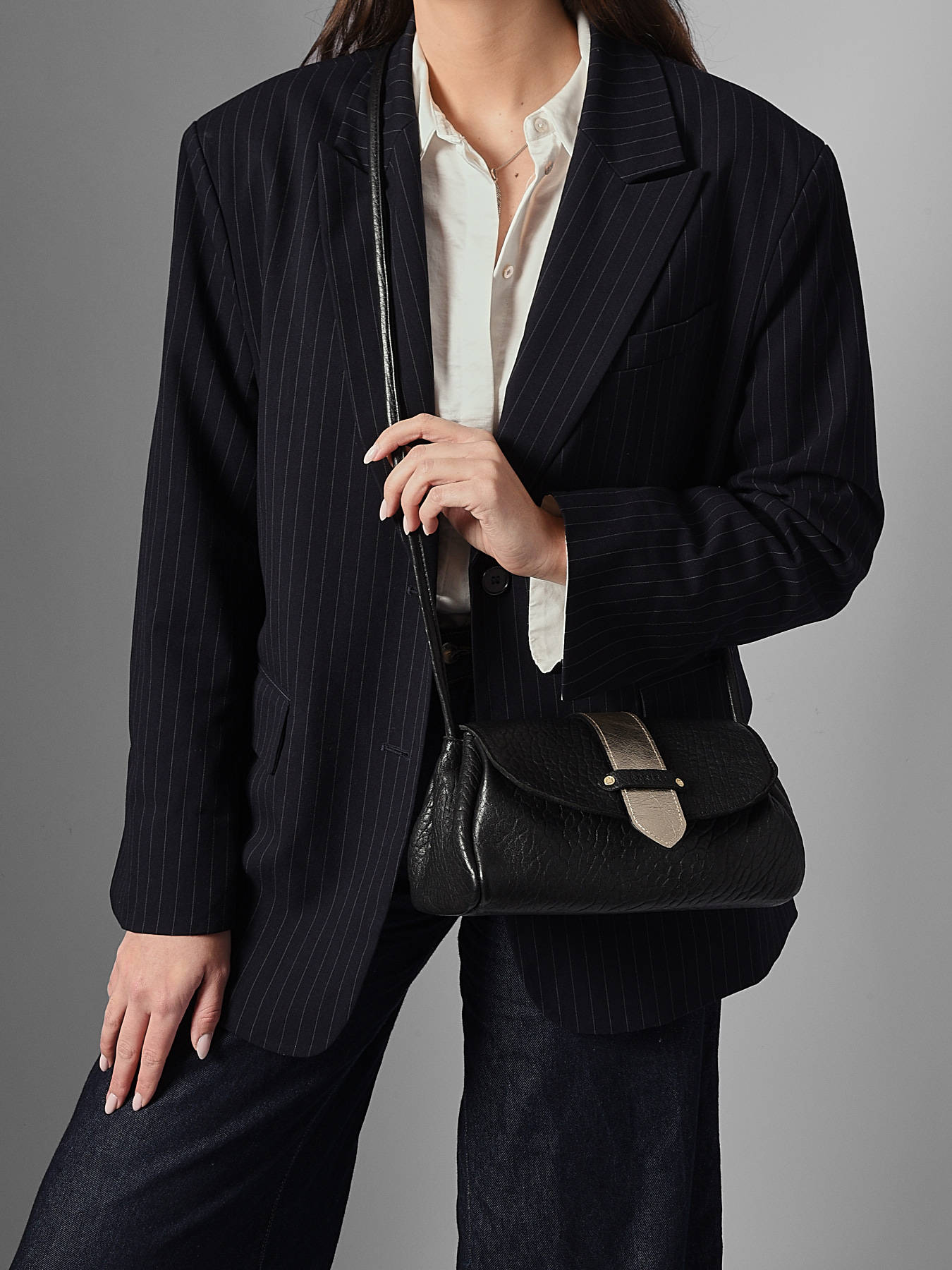 Le sac porté bandoulière AGNES par ETRIER est conçu en cuir de mouton crispé français. Ce modèle est présenté ici en taille M et se ferme par un rabat doté d'un bouton-pression aimanté. Il existe également en taille S pour celles et ceux qui souhaitent une contenance plus généreuse. Ce dernier est également agrémenté d'une languette réversible ; une face dorée et une face en cuir assortie au reste du sac, qui se fixe facilement grâce à deux boutons de col et se glisse dans une poche arrière prévue à cet effet.